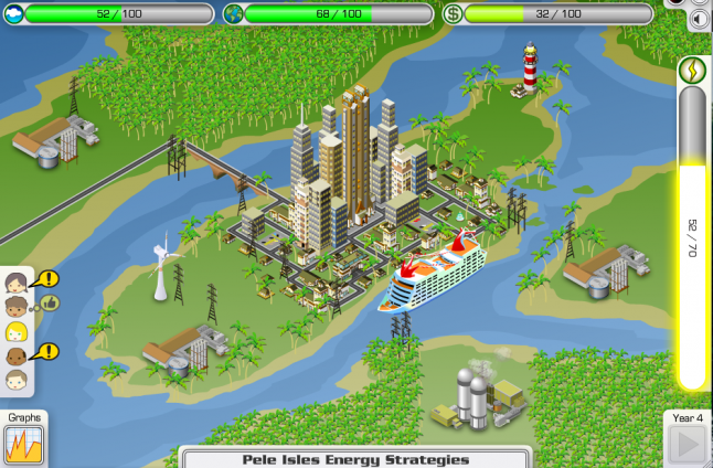 Educational games don’t need to be strictly accurate, either. Consider a game about history, like the upcoming CivilizationEDU spin-off of Civilization V, and Energy City, which is about developing different types of energy to support a city as it grows. Neither reflects reality. Both use made up data. Both “lie” about the details in their simulation. But both have great educational value. The former encourages the player to consider how things like technology, culture, and war shape history, and to develop an interest in key historical figures and societies. The latter drives the player toward an understanding that energy technologies change over time and that cities can produce and use energy in different or better ways.